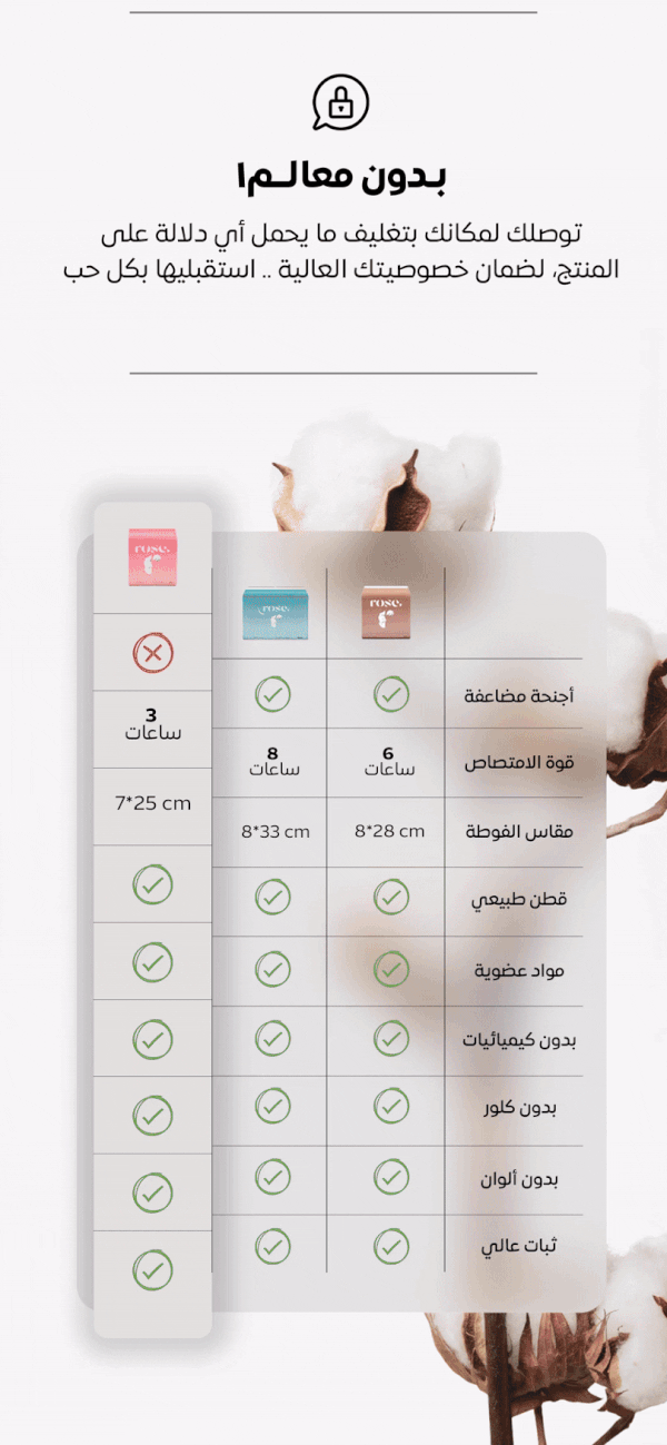 تمتعي بدورة شهرية آمنة ومريحة سواء أكنتِ في العمل أو المنزل أو في السفر بفضل المرونة والسلاسة والحماية التي تمنحك إياها روز سمول.